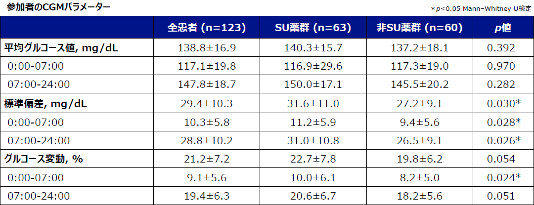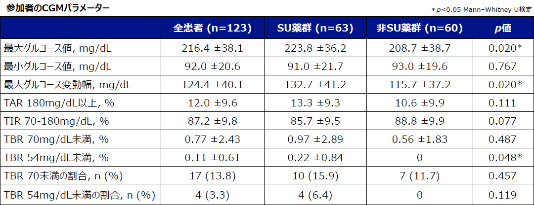 グルコース値の標準偏差(31.6mg/dL vs. 27.2mg/dL、p=0.030)、夜間標準偏差(11.2mg/dL vs. 9.4mg/dL、p=0.028)、夜間変動係数(10.0% vs. 7.9%、p=0.006)、最⼤グルコース値(223.8mg/dL vs.208.7mg/dL、p=0.020)、および変動幅(132.7mg/dL vs. 115.7mg/dL、p=0.020)は、SU薬群が⾮SU薬群と⽐較して有意に⾼いことが分かりました。