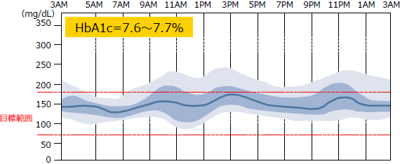 HbA1cが同程度であっても、⾎糖トレンドはさまざまです 。たとえHbA1cが同じ患者さんでも、1⽇における⾎糖変動パターンが⼤きく変動する場合があります 。