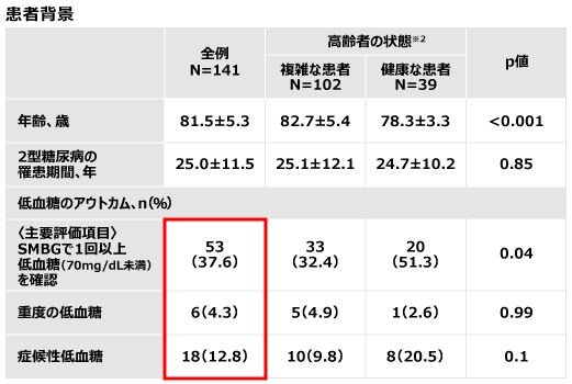 - 対象:インスリン治療中の75歳以上の2型糖尿病患者のうち、1日2回以上のSMBG(self-monitoring of blood glucose:血糖自己測定)で血糖管理を行っている患者155例