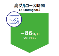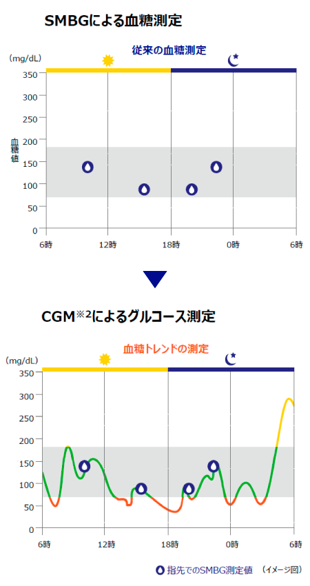 SMBGによる血糖測定は、測定時の値はわかりますがその間のトレンドがわからないため、十分な血糖管理の達成が困難な場合があります。