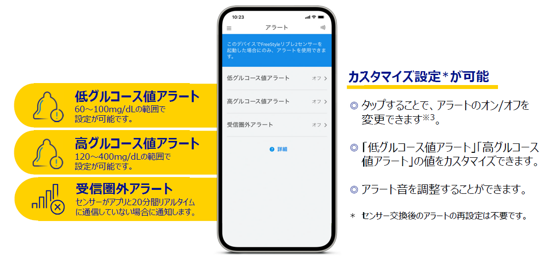 糖尿病のある人のライフスタイルに合わせて、「低グルコース値アラート」「高グルコース値アラート」「受信圏外アラート」のオン/オフを選択することができます。