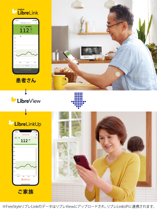 「FreeStyleリブレLink」で1分毎にリアルタイムで測定したグルコース値を、ご家族や介助者が一緒に確認できるから、患者さんは安心して糖尿病の自己管理に取り組むことができます。