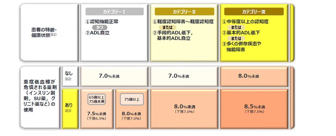 - 注2:高齢者糖尿病においても、合併症予防のための目標は7.0%未満である。ただし、適切な食事療法や運動療法だけで達成可能な場合、または薬物療法の副作用なく達成可能な場合の目標を6.0%未満、治療の強化が難しい場合の目標を8.0%未満とする。下限を設けない。カテゴリーIIIに該当する状態で、多剤併用による有害作用が懸念される場合や、重篤な併存疾患を有し、社会的サポートが乏しい場合などには、8.5%未満を目標とすることも許容される。